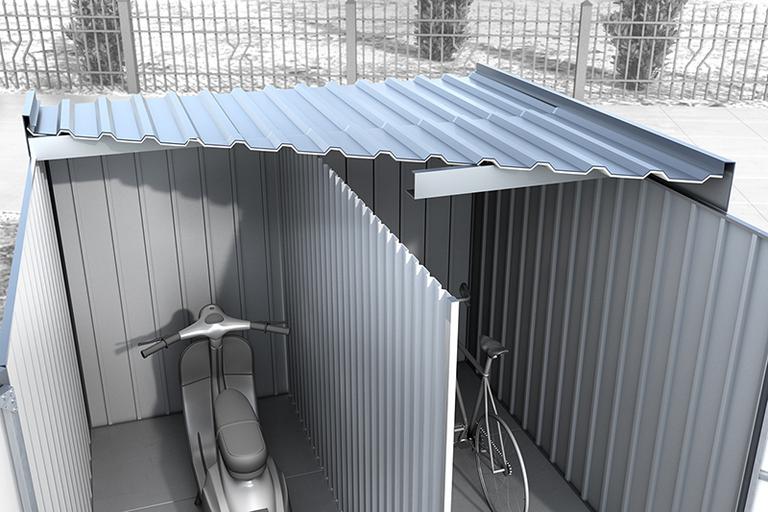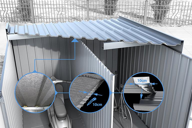 Grundsätzlich besteht die gesamte Konstruktion aus verzinkten Blechen. Diese bieten einen besonders hohen Schutz vor Korrosion. Sie haben aber auch die Möglichkeit, eine lackierte Version zu wählen. Es stehen zahlreiche Farbtöne zur Auswahl, sodass auch Ihre Lieblingsfarbe dabei ist. Damit es bei Temperaturschwankungen im Gartenhaus Dual nicht vom Dach heruntertropft, können Sie für die Dachunterseite eine Vliesbeschichtung wählen. Es stehen aber noch weitere Ausstattungen zur Wahl. Zur besseren Belüftung können bei der Bestellung gleich Ausführungen mit vorgefertigten Belüftungsöffnungen ausgesucht werden. Sehr hilfreich sind auch die auf Wunsch erhältlichen vormontierten Türstopper. Diese verhindern, dass die Doppeltür im geöffneten Zustand vom Wind hin und her bewegt wird.