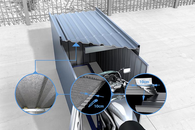 Die STEVIK Motorradgarage von Baudiscount kombiniert praktisches Design mit sicherer und eleganter Bauweise. Diese Motorradgarage ist aus hochwertigem, feuerverzinktem und pulverbeschichtetem Stahl gefertigt, was einen langlebigen Schutz gegen alle Witterungseinflüsse garantiert. Ideal für Motorradbesitzer, die Wert auf Funktionalität und Ästhetik legen, bietet diese Garage eine solide und attraktive Lösung für die sichere Aufbewahrung Ihres Motorrads für Jahrzehnte.
